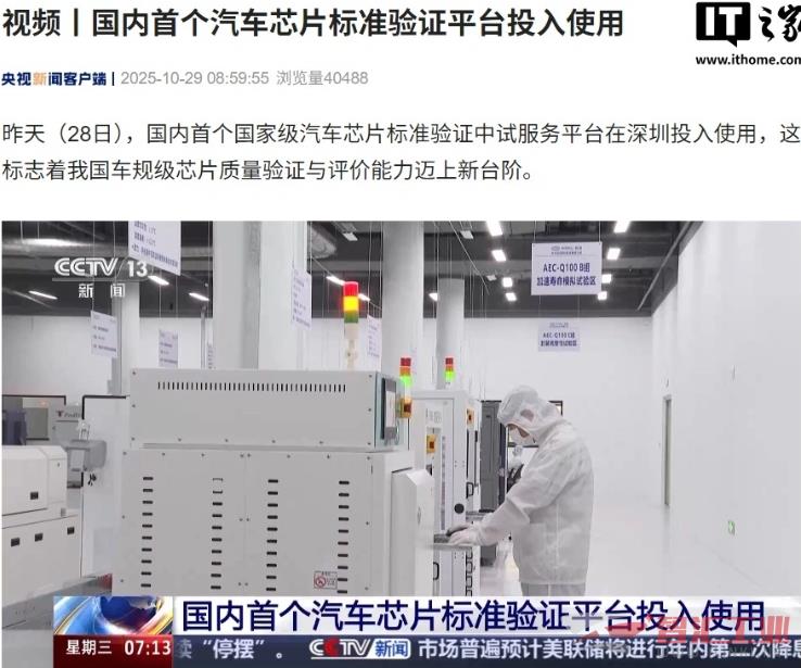 10月29日消息,据央视新闻报道,国内首个国家级汽车芯片标准验证中试服务平台于 10 月 28 日在深圳投入使用,这标志着我国车规级芯片质量验证与评价能力迈上新台阶。