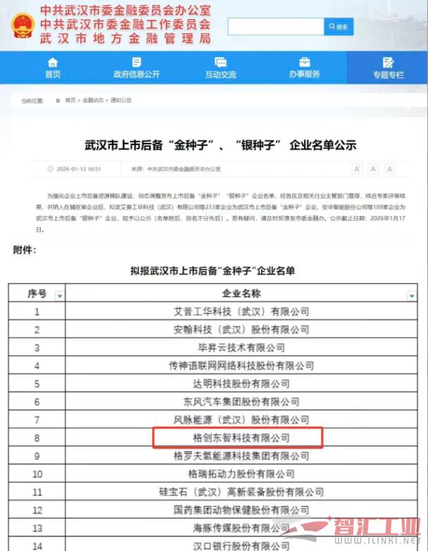 1月18日,中共武汉市委金融委员会办公室发布的武汉市上市后备“金种子”“银种子”企业名单公示期结束,格创东智凭借其在工业人工智能领域的领先技术实力与扎实的市场表现,成功入选最具含金量的“金种子”企业名录。此次入选,标志着公司技术领先性、成长潜力与发展模式获得了关键性认可。