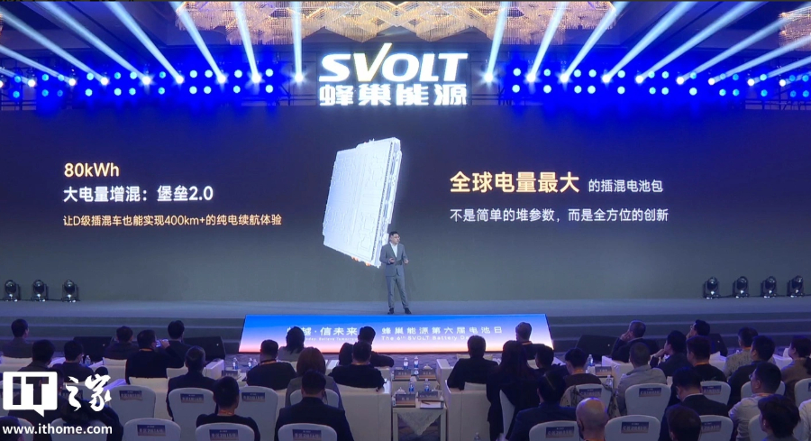 1 月 13 日消息,蜂巢能源第六届电池日于今日在江苏常州召开,蜂巢能源针对全球家庭用车向大五 / 六座进阶带来的“大电量插混”需求推出了全球最大电量 80 kWh 插混电池包“堡垒 2.0”。[详情]